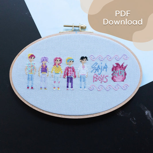 Straight from the screen of K-Pop Demon Hunters this pattern captures the iconic 'Soda Pop' era of the world's favourite fictional Korean boy band. Featuring all five members ("Jinu", "Baby", "Romance", "Mystery" and "Abby") in their signature colourful outfits, the official Saja Boys logo, and a flicker of demonic fire behind the Korean Hangul 악마 for "Demon," it's the perfect blend of K-pop sparkle and supernatural grit.
