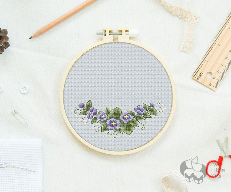 - A floral banner designed to fit in a 6in hoop when stitched on 14ct Aida.