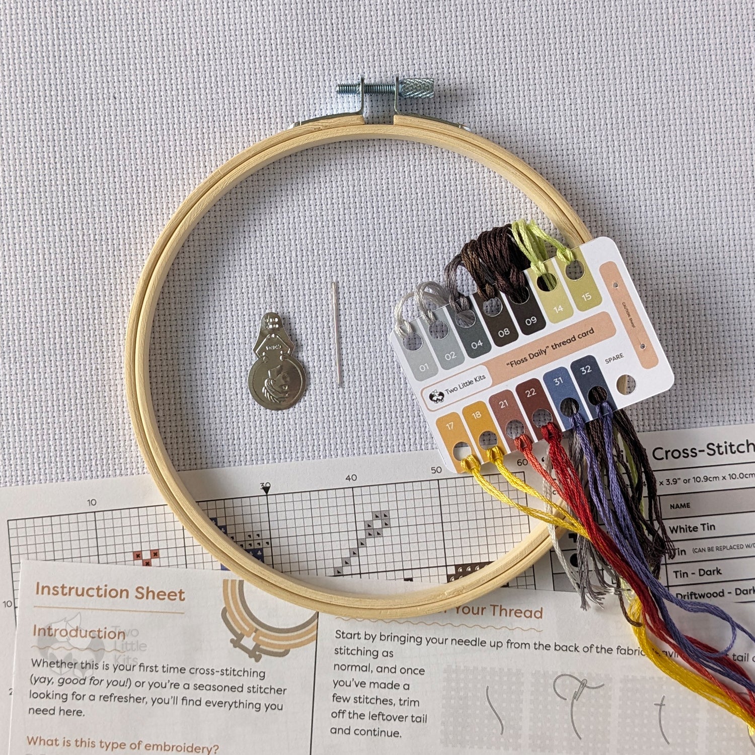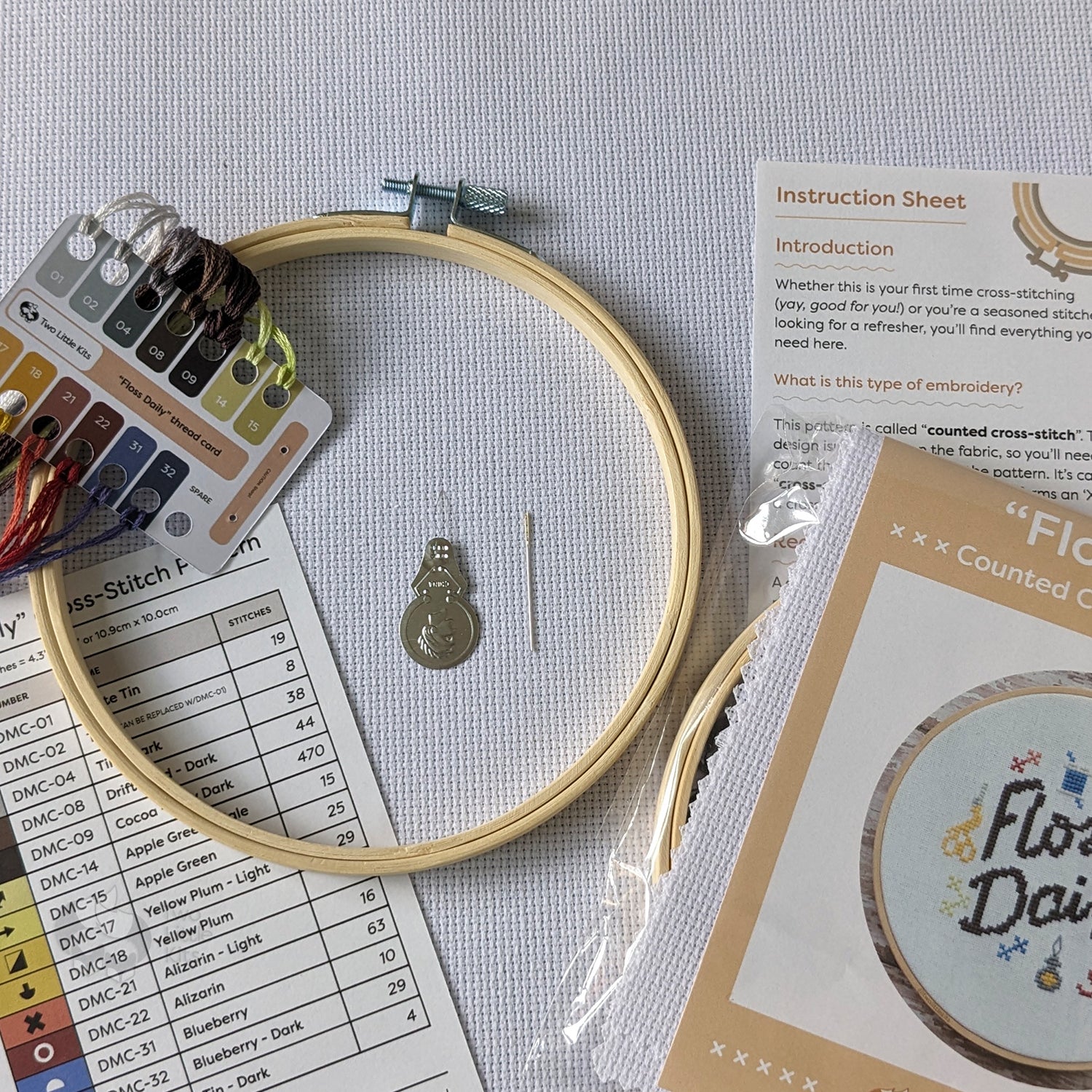 - All required 13 DMC floss colours pre-cut to manageable lengths