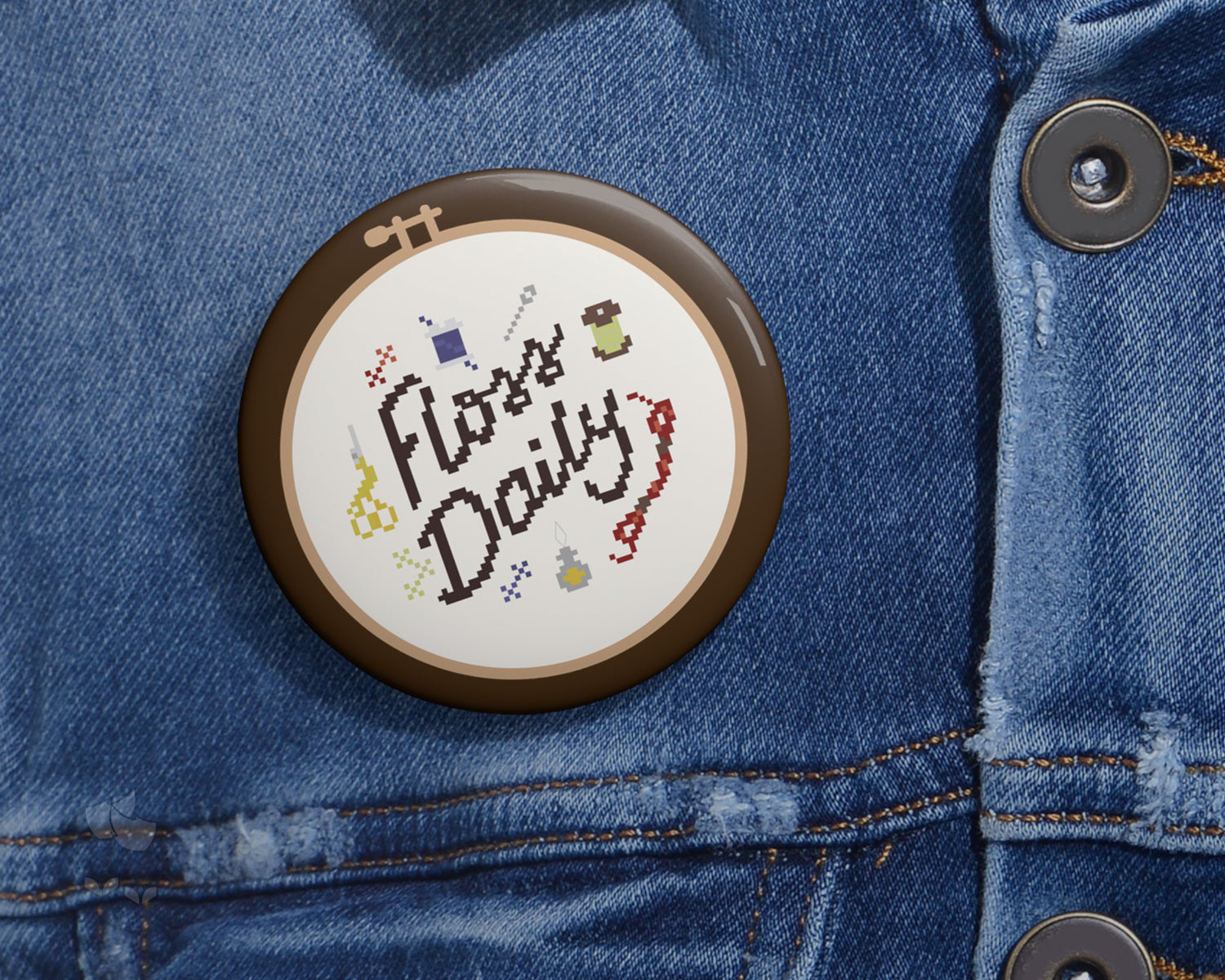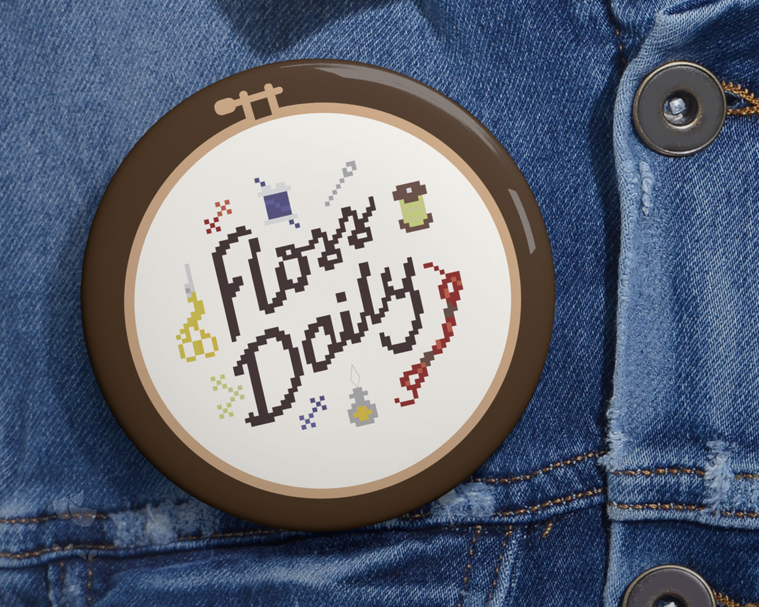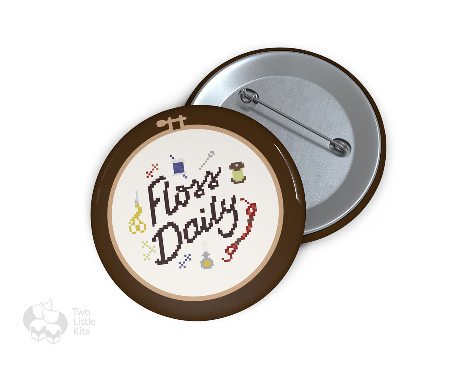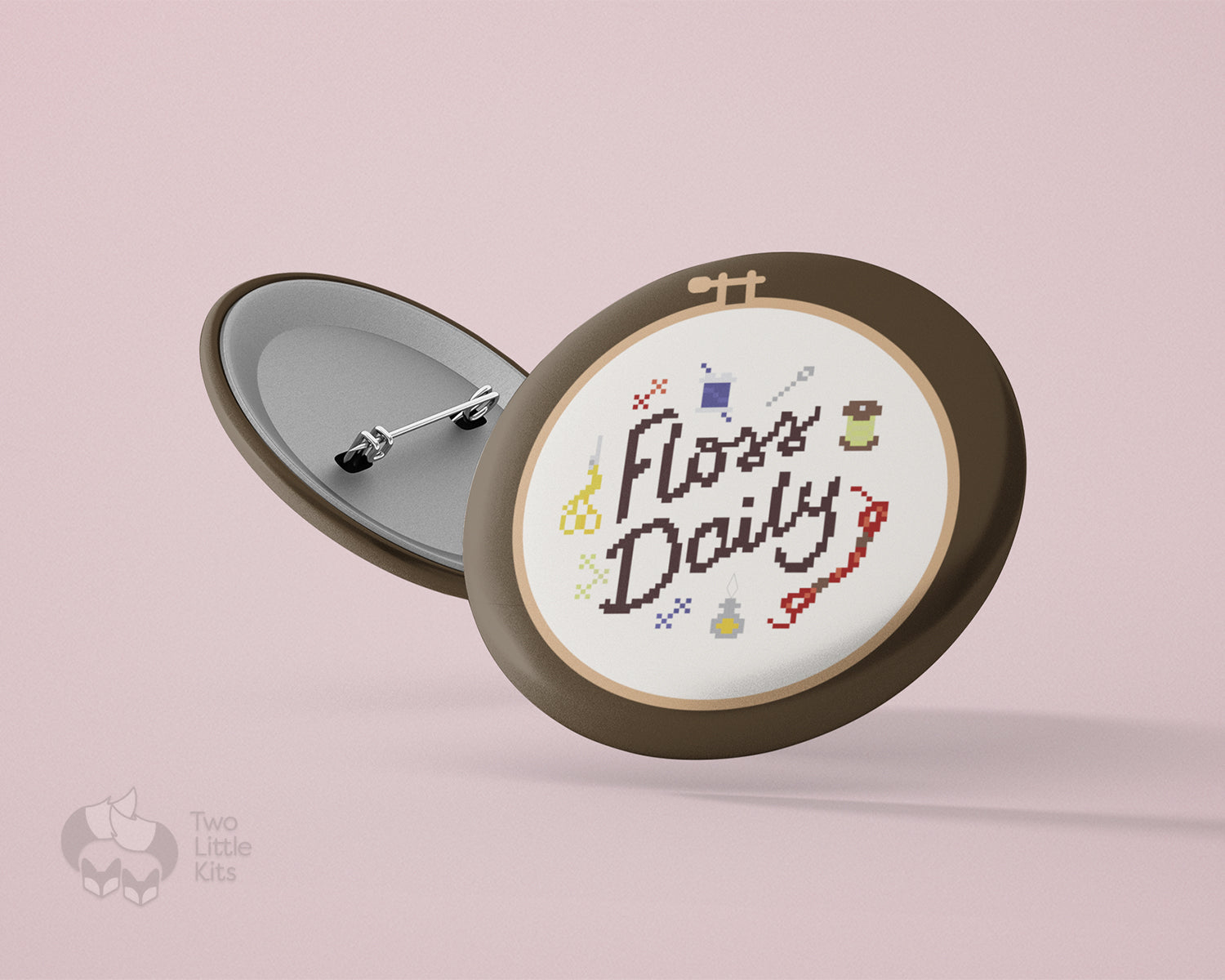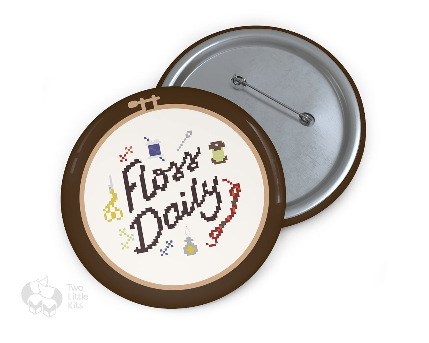 Based on my cross-stitch pattern of the same name: "Floss Daily", this pin comes in three different sizes and are made from metal, yet are lightweight and durable with a strong safety pin.