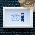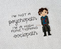 A quote from the BBC TV show, ‘Sherlock’, this piece says “I’m not a psychopath, I’m a high functioning sociopath” and has a cross-stitch person to the likeness of the title character, Sherlock.