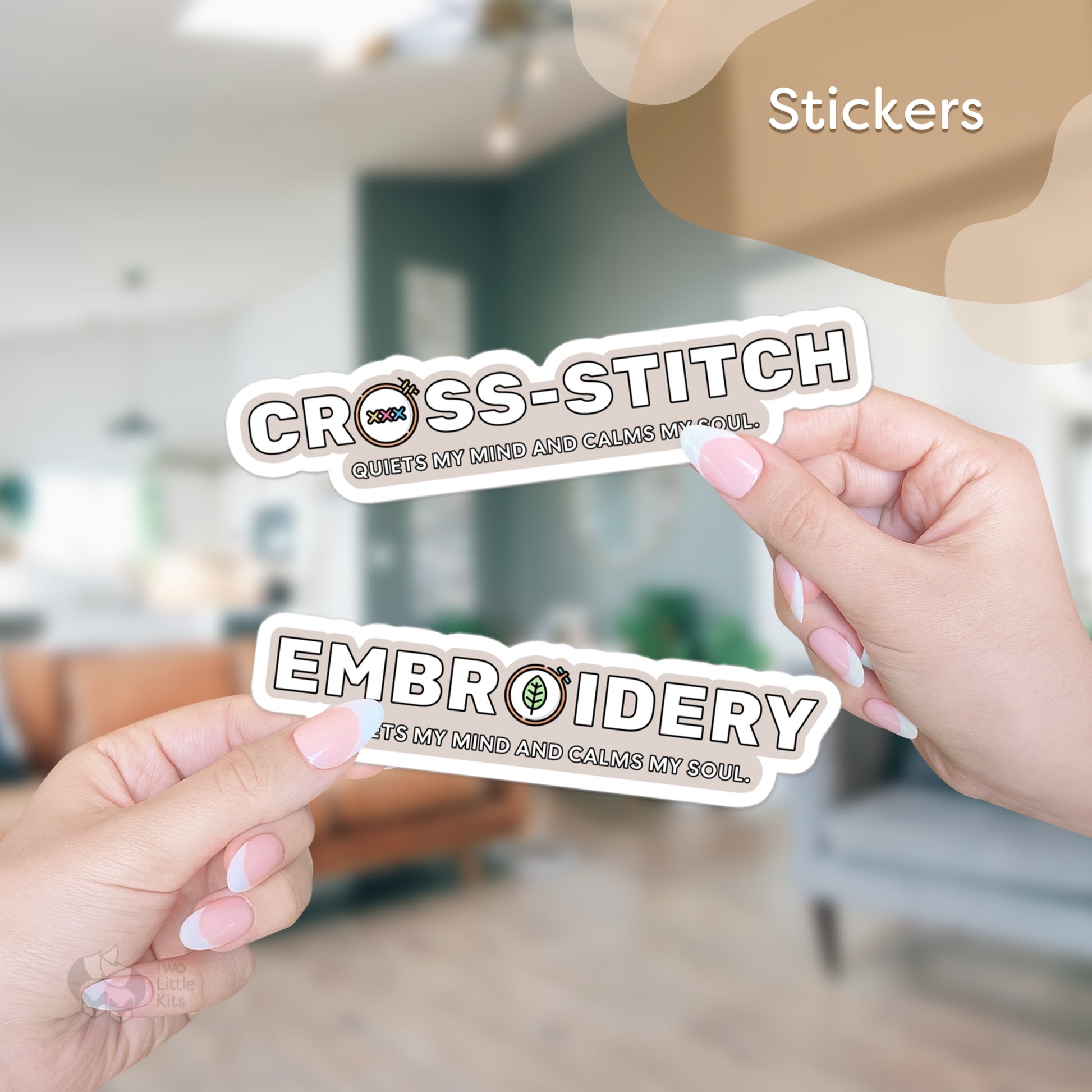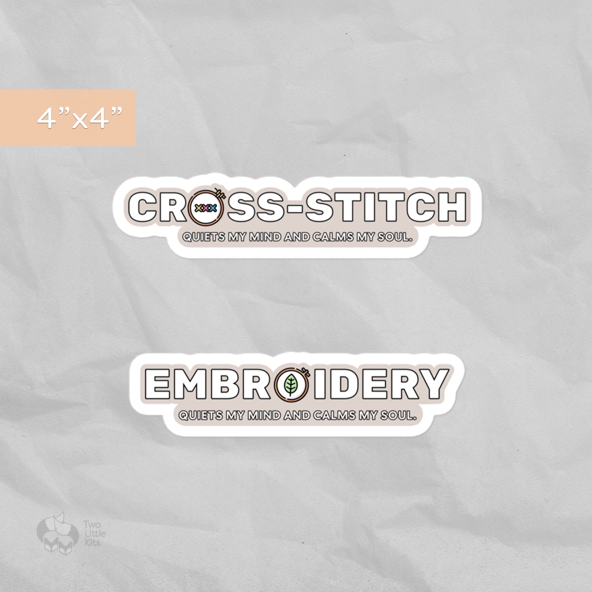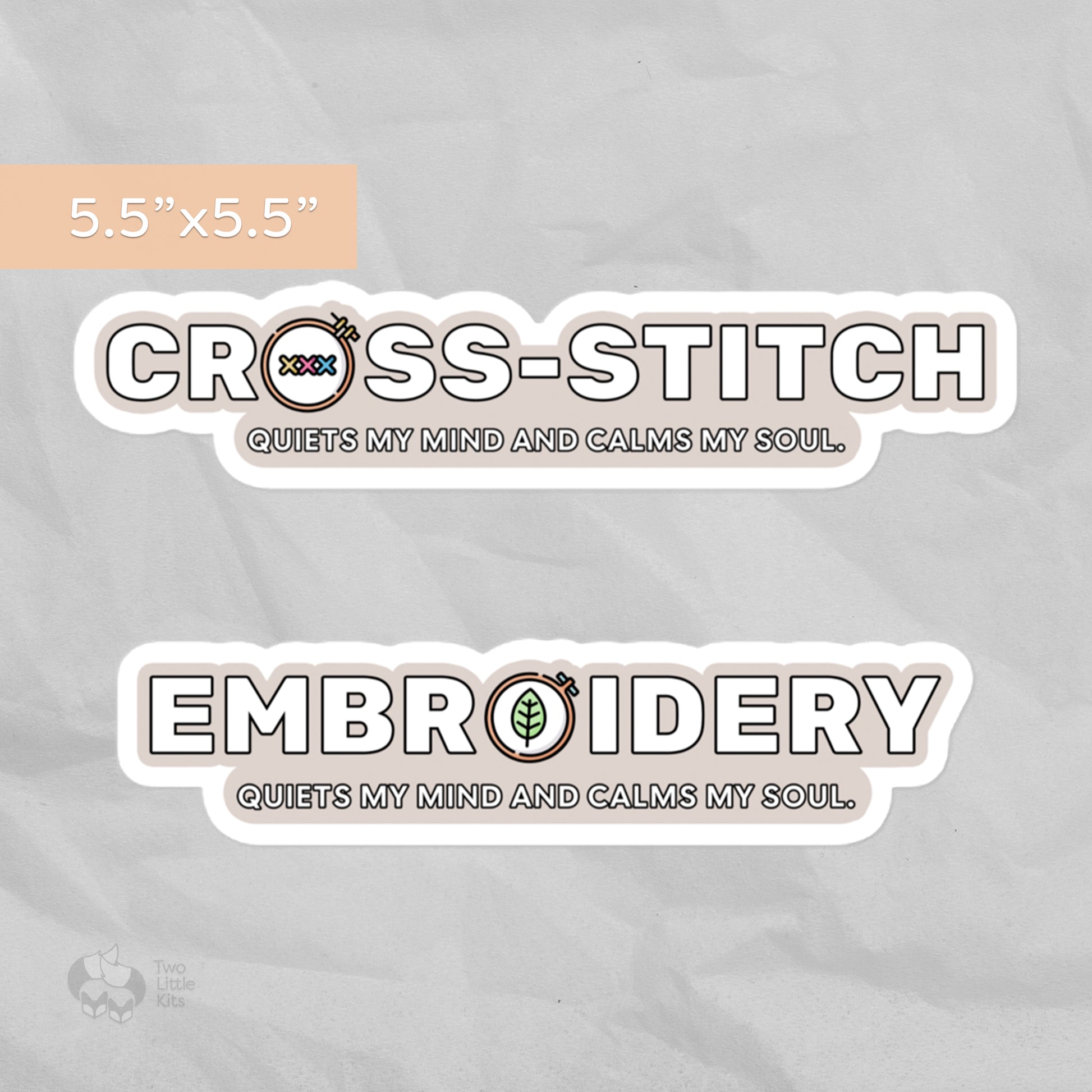 These stickers display the comforting phrases "Cross-stitch quiets my mind and calms my soul" or "Embroidery quiets my mind and calms my soul", each accompanied by an adorable embroidery hoop icon. Whether it’s a tiny cross-stitch piece or a delicate embroidered leaf, these designs add a peaceful touch to your favorite items.