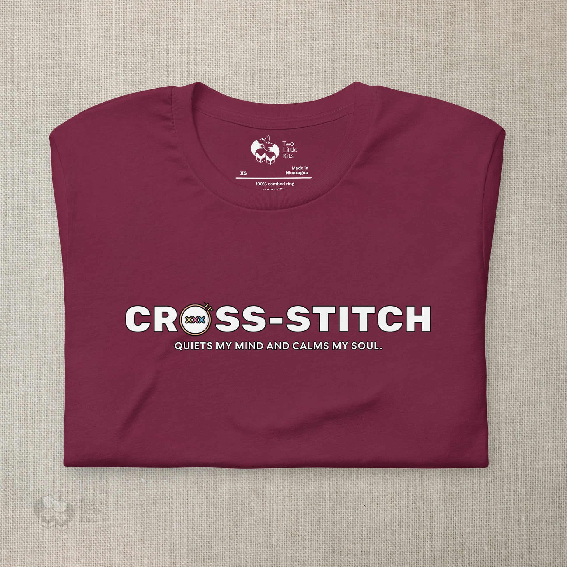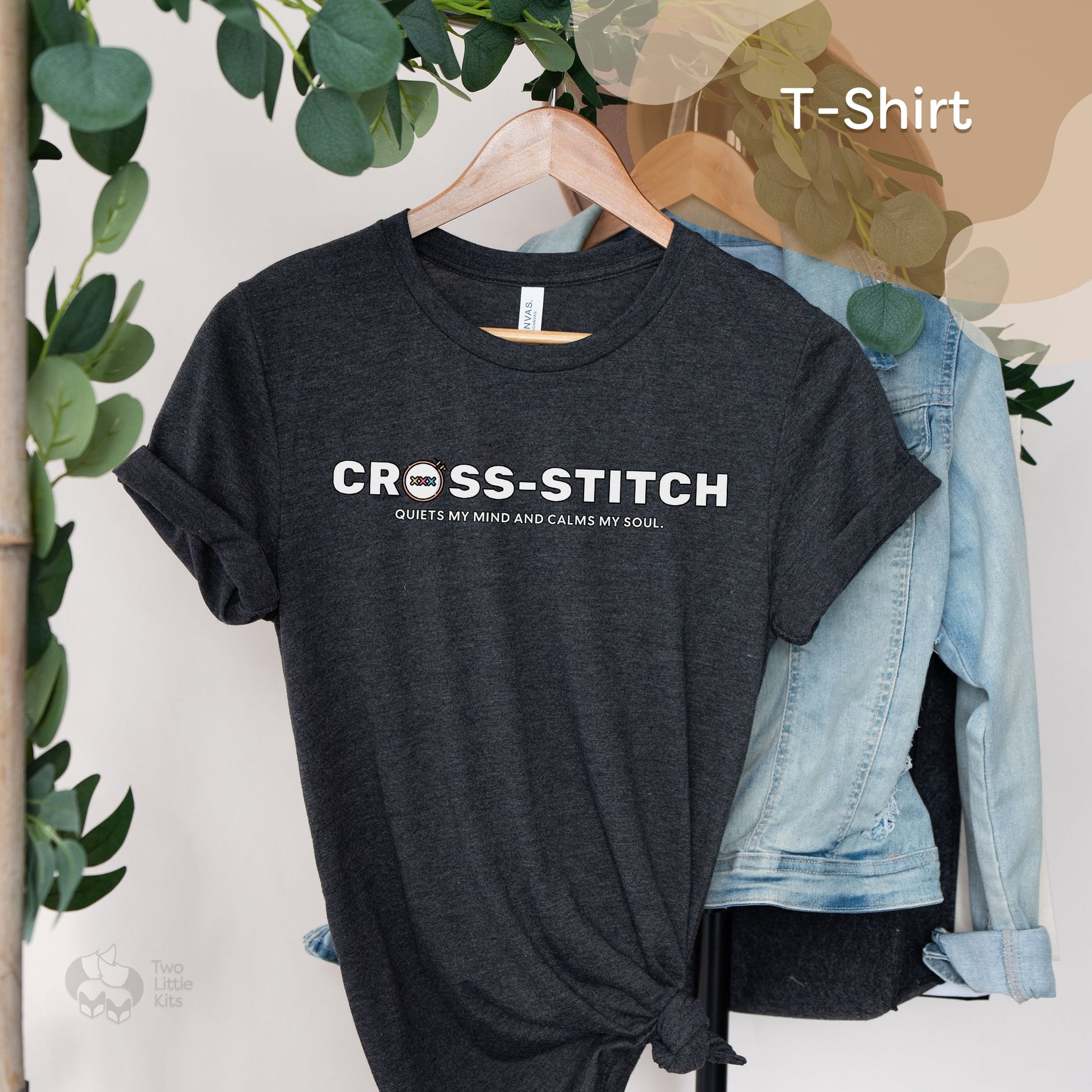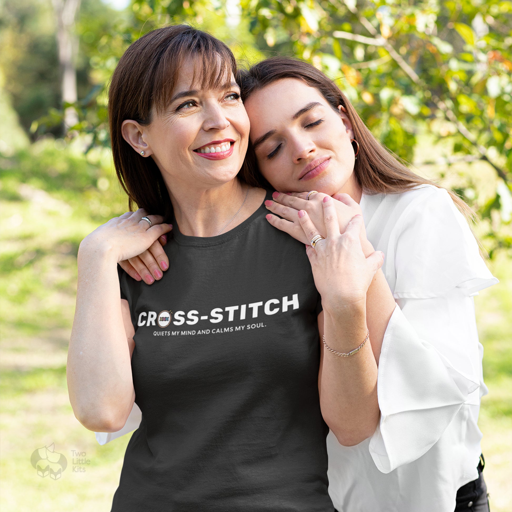 The "Quiet Mind" T-shirts display the soothing phrases "Cross-stitch quiets my mind and calms my soul" or "Embroidery quiets my mind and calms my soul," complemented by a charming embroidery hoop icon. The minimalistic white text and simple design ensure that the T-shirts are elegant without being overpowering, making them suitable for any casual occasion.