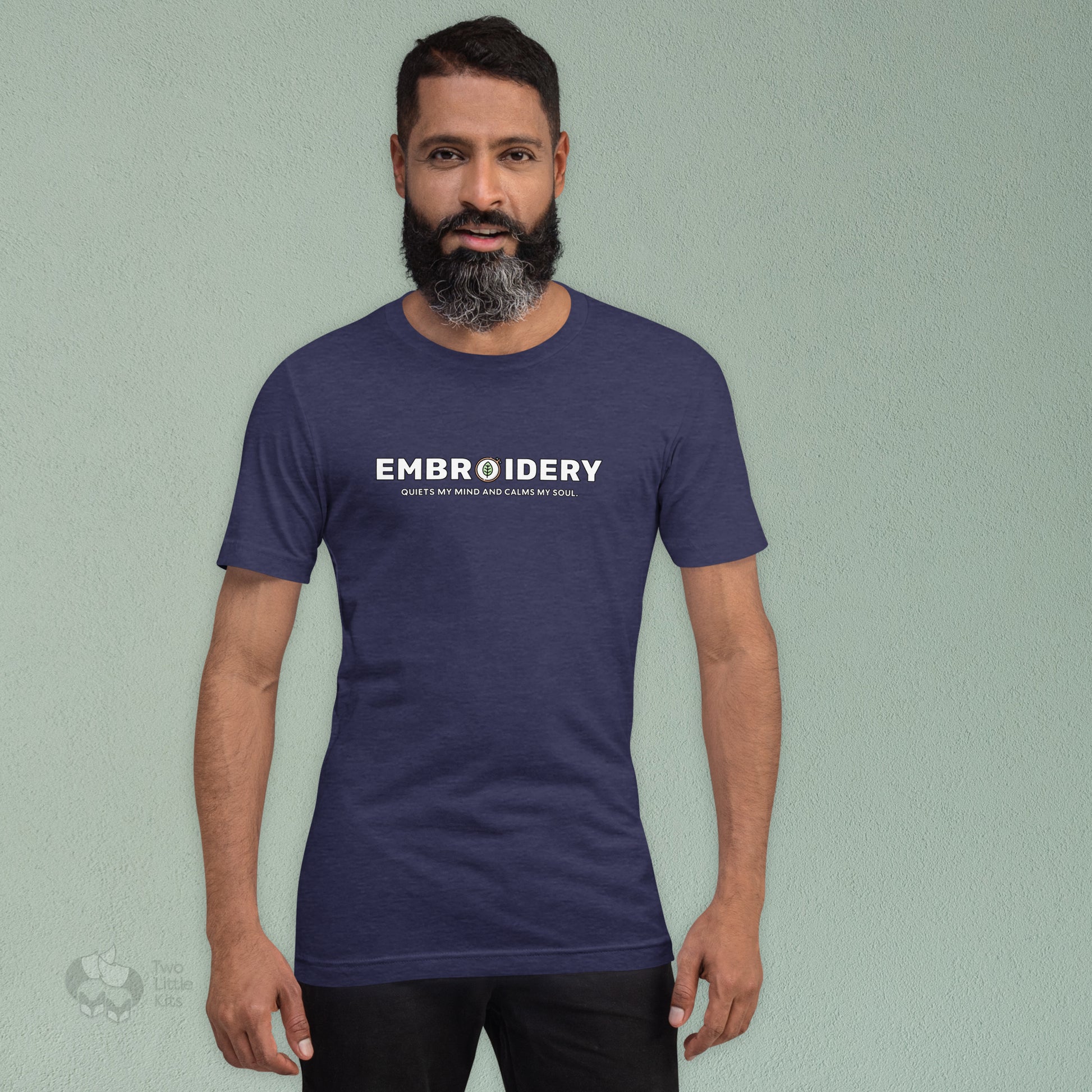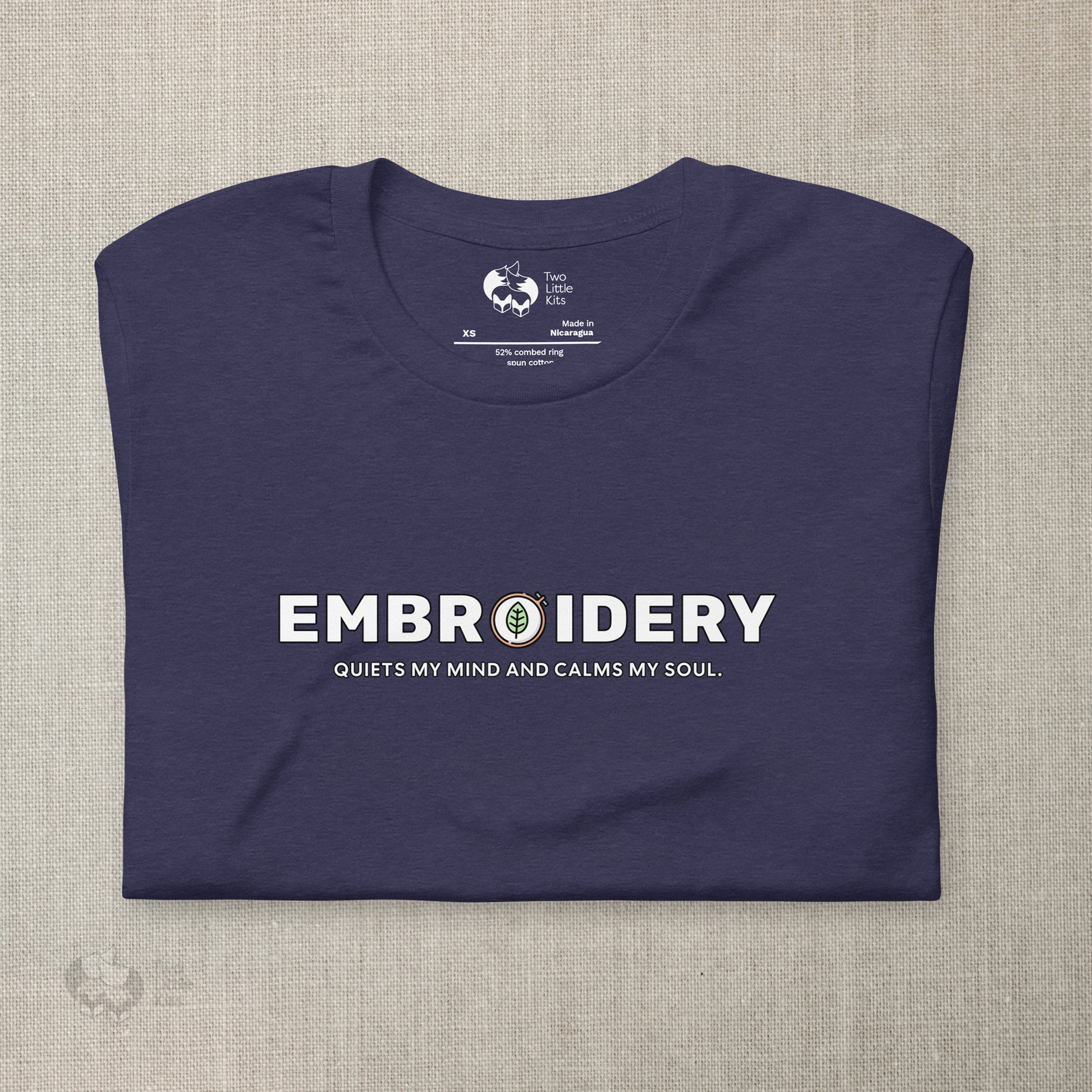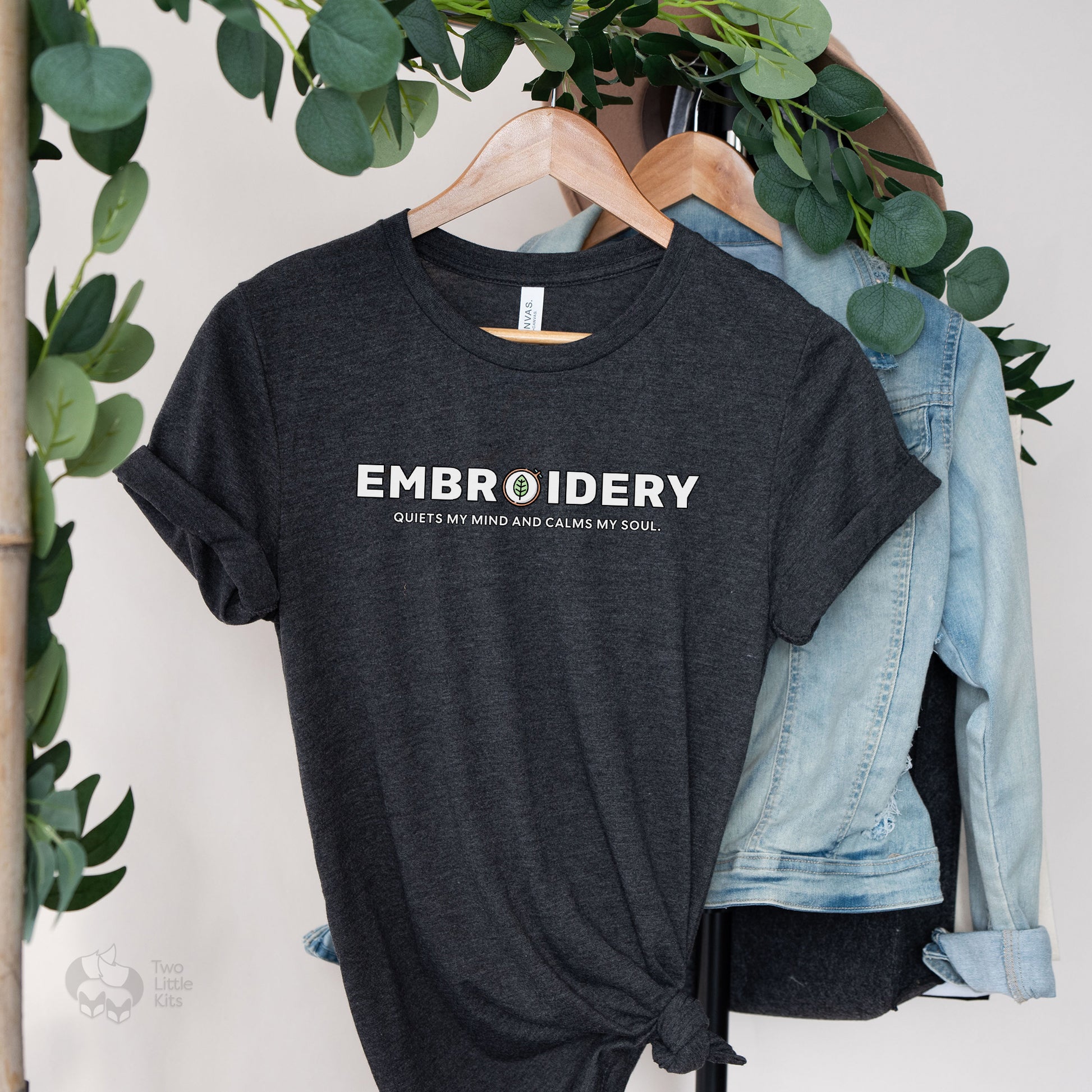 The "Quiet Mind" T-shirts display the soothing phrases "Cross-stitch quiets my mind and calms my soul" or "Embroidery quiets my mind and calms my soul," complemented by a charming embroidery hoop icon. The minimalistic white text and simple design ensure that the T-shirts are elegant without being overpowering, making them suitable for any casual occasion.