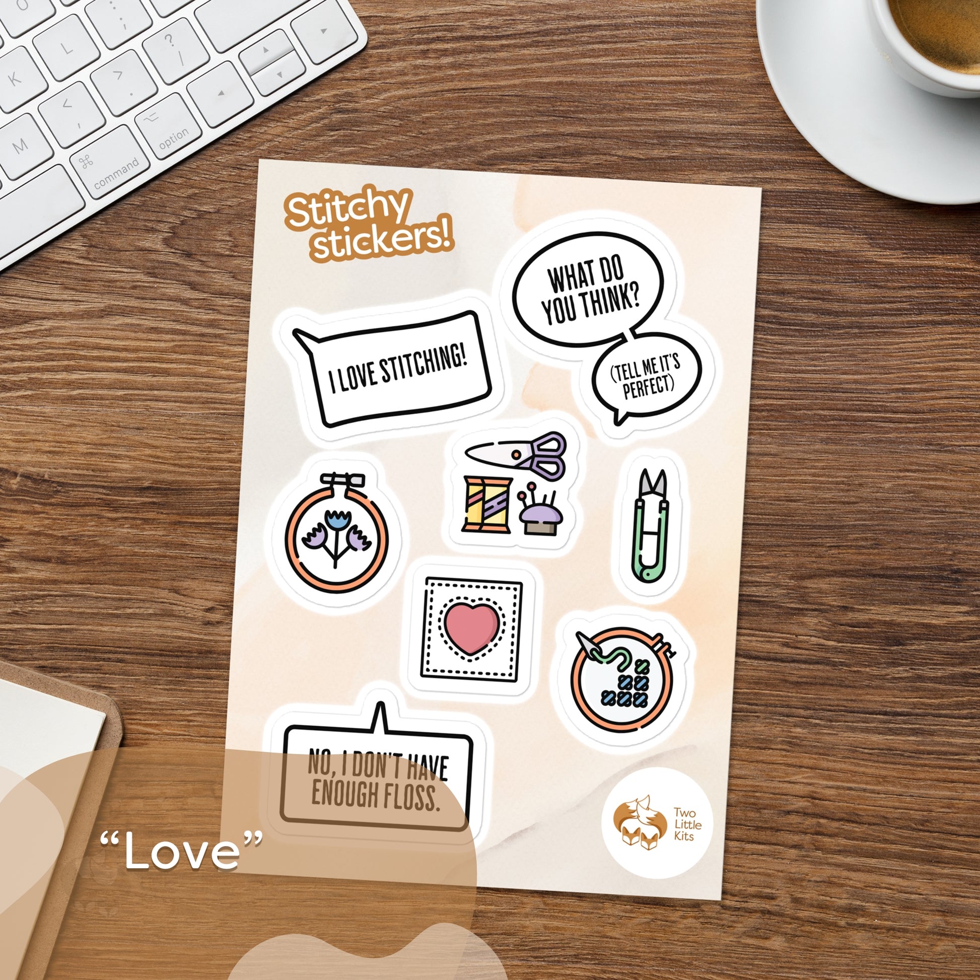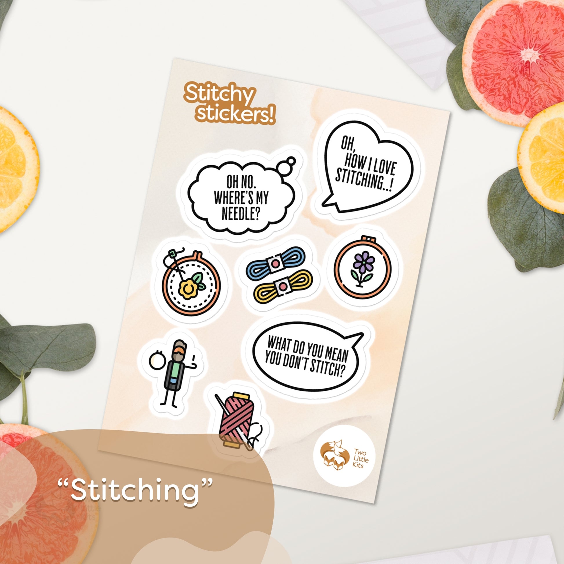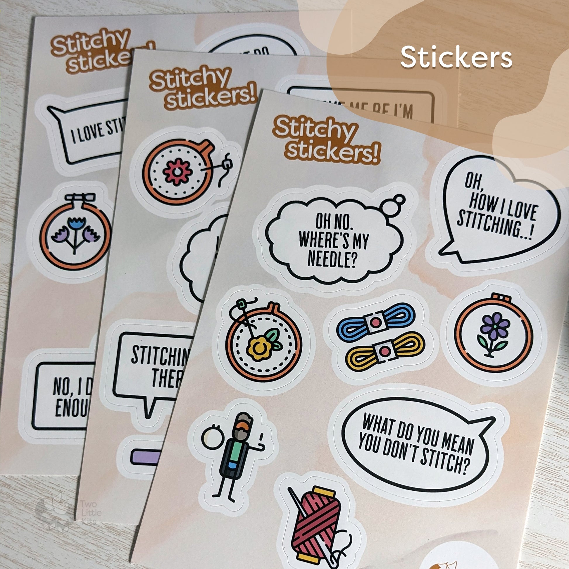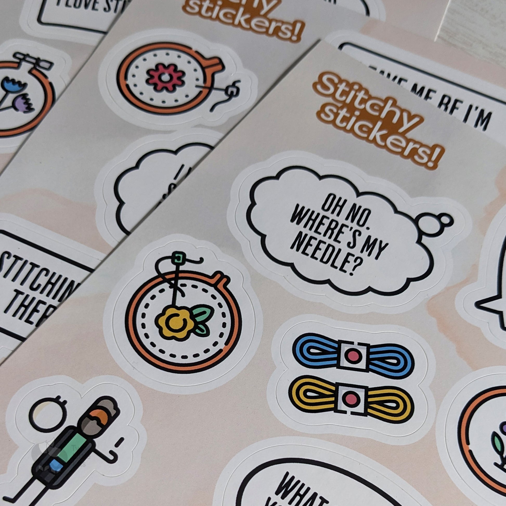 Elevate any cross-stitch and embroidery projects with these adorable sticker sheets! Each sheet features a collection of cute, icon-like images that capture the heart of stitchy life. From playful speech bubbles that speak to every stitcher—like "I wonder if I should start a new project?" and "No, I don't have enough floss!"—to charming motifs, these stickers are a must-have for any crafting enthusiast.