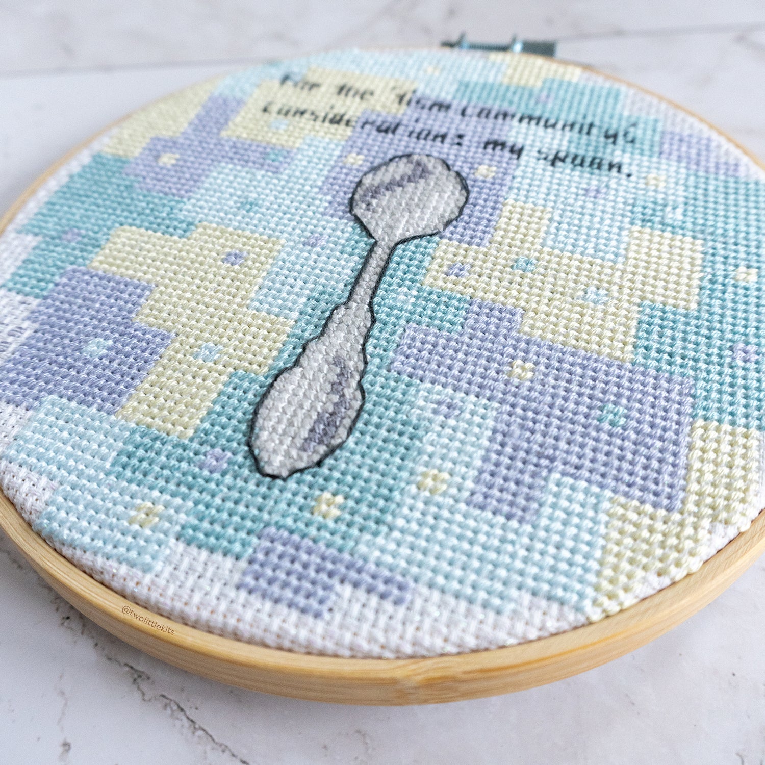 While it's mostly a playful tribute to the first meaning -that sense of comfort in the familiar and "just right"- it also quietly touches on Spoon Theory, the metaphor for managing limited energy and care. Together, it's a small but powerful mix of humour, solidarity, and self-awareness — ideal for any stitcher who's ever had a favourite utensil or run out of spoons.