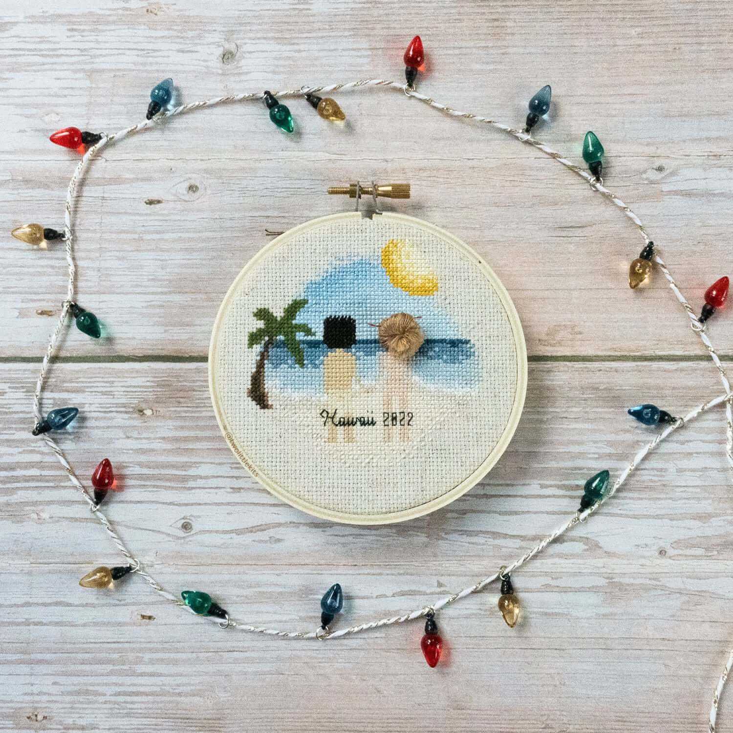 Every custom piece is hand stitched by myself to your specifications using beige 14ct (or 28ct depending on availability - will still be the same size) Aida cloth with DMC embroidery floss. Each piece is finished in an embroidery hoop or mounted on a board, ready for framing.